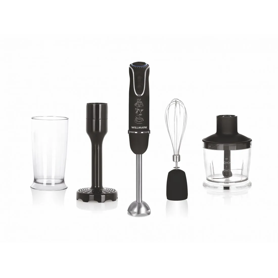 Прибор предназначен для смешивания жидкостей и мягких ингредиентов. Снабжен новым электромотором с мощным и мягким звучанием без вибраций. Корпус блендера выполнен из чёрного пластика с покрытием SOFT TOUCH, что придает ему стильный вид и добавляет комфорта при использования. Мощность прибора составляет 900 Ватт. На блендере установлена кнопка включения блендера, а также TURBO кнопка высокоскоростного режима. На верхней части корпуса расположен регулятор скорости работы мотора с пятью регулировками и световой индикатор работы в виде кольца с фиолетовой подсветкой. По бокам корпуса расположены кнопки для снятия сменных насадок. В комплект к изделию входит стальная насадка измельчитель твёрдых продуктов – зелени, орехов или овощей, венчик для взбивания яичных белков, сливок, десертов и пластиковый стакан с мерной шкалой до 600мл. В дополнение прилагается насадка с чащей на 500 мл для измельчения овощей, мяса и приготовления салатов. На дне чаши установлены прорезиненные ножки. В комплект также входит насадка для приготовления картофельного пюре с пластиковым шнеком. Длина сетевого шнура 118 сантиметров с сечением провода 2х0,5 мм. Приобретая данный прибор вы получаете в своё распоряжение целый кухонный комбайн и незаменимого помощника на кухне. При правильном использовании, изделие прослужит Вам в течение многих лет.